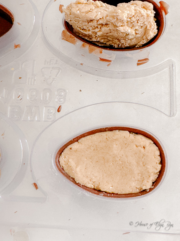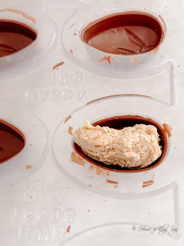 Carefully place the chocolate egg tops back into the bottom molds for support and add the peanut butter filling, pressing it with your finger or a spoon to level it. Add more filling if necessary until the eggs are packed and filled to the top.