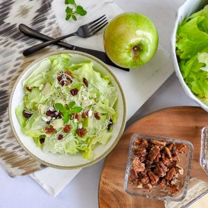 This recipe yields a double batch of candied pecan pieces, which can be stored for later use or added to the salad for extra crunch. If you don’t want any leftovers, feel free to halve the pecan ingredients. Please note that the nutritional information is based on using 3/4 cup in the recipe.