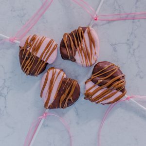 Peanut butter crispy rice hearts dipped in chocolate and finished with chocolate-peanut butter stripes